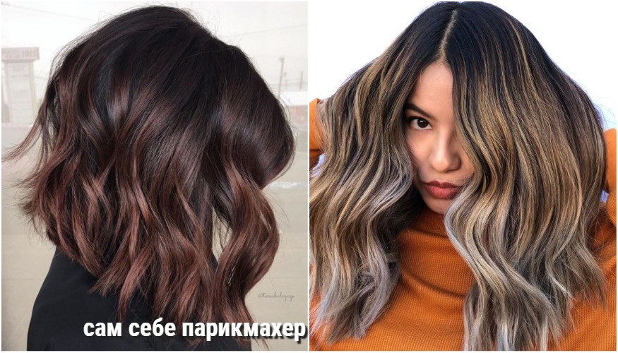 Если вы устали от черного цвета волос, то их легко превратить в каштановый оттенок. Попросите мастера сделать балаяж коричнево-красноватыми прядями. Получится шикарный мягкий цвет.