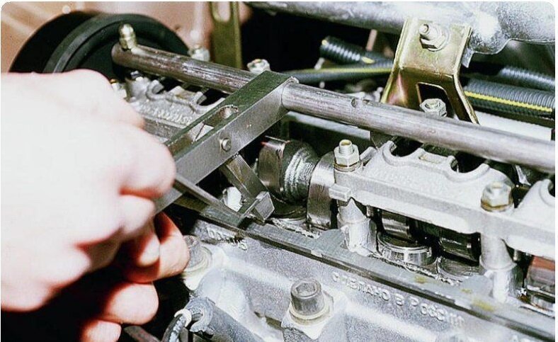 Проверьте набором щупов зазоры у 1 -го и 3-го кулачков распределительного вала. Если зазор отличается от нормы, то приспособлением для утапливания толкателей клапанов или оправкой утапливайте толкатель клапана и фиксируйте его в нижнем положении, установив между краем толкателя и распределительным валом фиксатор.