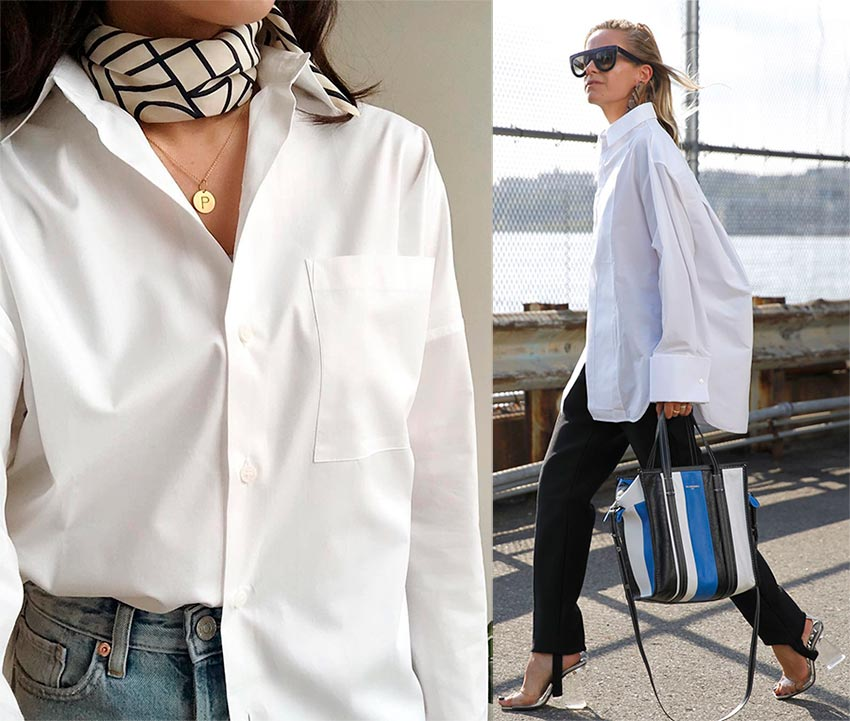 Начну этот список с того, что гармонично впишется в абсолютно любой гардероб – это белая рубашка. Обращаем внимание на посадку — рубашка должна быть свободной, полуприлегающей, материал не должен просвечивать. Рубашку можно носить практически со всем — как верх, третий слой, подвязывать поверх топа, на более холодное время можно сочетать с водолазкой. Примеры оставлю в