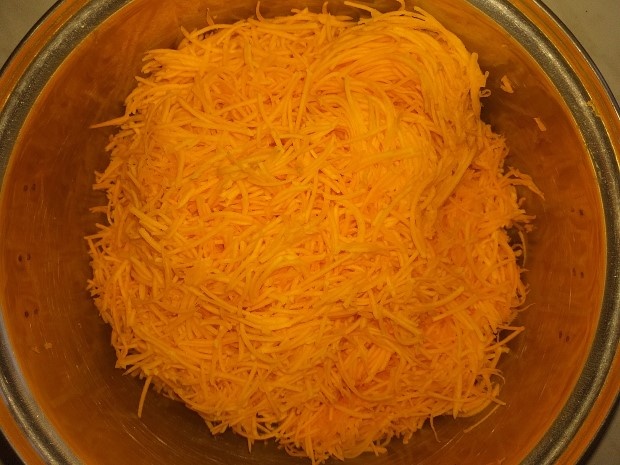 Тыкву нужно очистить, разрезать, вынуть семечки, натереть на крупной тёрке. Можно воспользоваться комбайном.