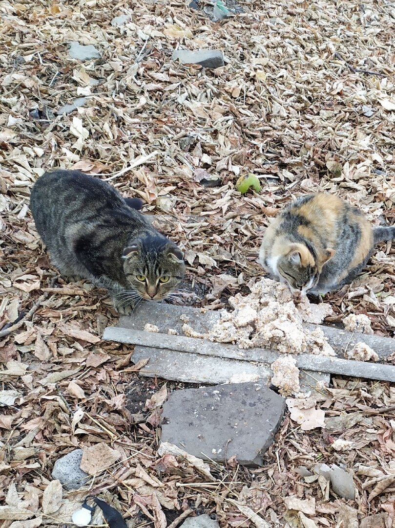 Так у нас на поселке (Павоградское) живут домашние котики, (это то самое село где находится домашний мини-приют Людмилы Ч). В ожидании когда волонтер принесет покушать, узнают шаги женщины из далека. Их дом находится напротив мусорника, так они и познакомились, только сначала была две кошечки трехцветочка и Алиса (которую уже давно волонтер забрала на передержку) потом начал выбегать вислоухий,