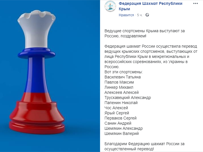 Федерация шахмат Республики Крым поздравила ведущих крымских шахматистов с тем, что Федерация шахмат России перевела их из Украины в Россию.