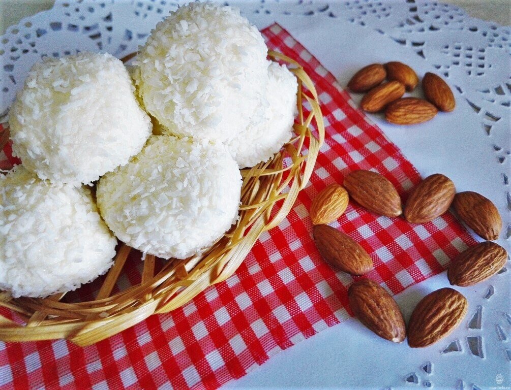 Не ожидала, что будет так вкусно! Я поделюсь с Вами сразу двумя вкуснейшими рецептами домашних Рафаэлло! Получается очень достойный аналог, некоторые даже считают, что домашние конфетки выходят менее жирными! Первый рецепт действительно занимает не более 10 минут! Второй немного больше, но кому-то он может показаться интереснее! Обязательно читайте статью до конца, Вам будет интересно! =) Рецепт домашних Рафаэлло №1 Ингредиенты: 1) Высыпьте в миску сухое молоко, постепенно добавляйте сгущенку, непрерывно помешивая. Масса должна получиться густой и тянущейся; 2) Отщипните одной или двумя столовыми ложками кусочек сгущенной массы, влажными чистыми руками положите внутрь орешек, сформируйте шарик и обваляйте в кокосовой стружке; 3) Проделайте то же самое с оставшейся массой сгущенки и сухого молока. Потрясающе вкусные конфетки готовы, их можно сразу есть! Без орешка такие конфеты получаются тоже очень вкусными, а одна моя подруга вообще любит класть внутрь шоколадный хрустящий шарик из г