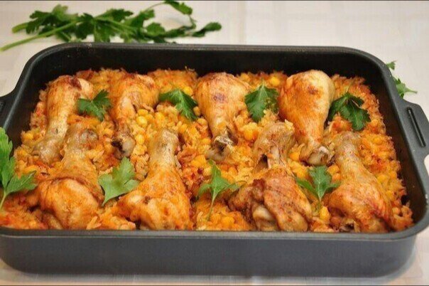 Курица по праву считается диетическим продуктом. Особенность состоит лишь в том - как её готовить, чтобы она получилась максимально вкусной и полезной. Попробуйте приготовить в духовке куриные ножки со сладкой кукурузой и рисом. Насладитесь оригинальным блюдом с уникальным вкусом.