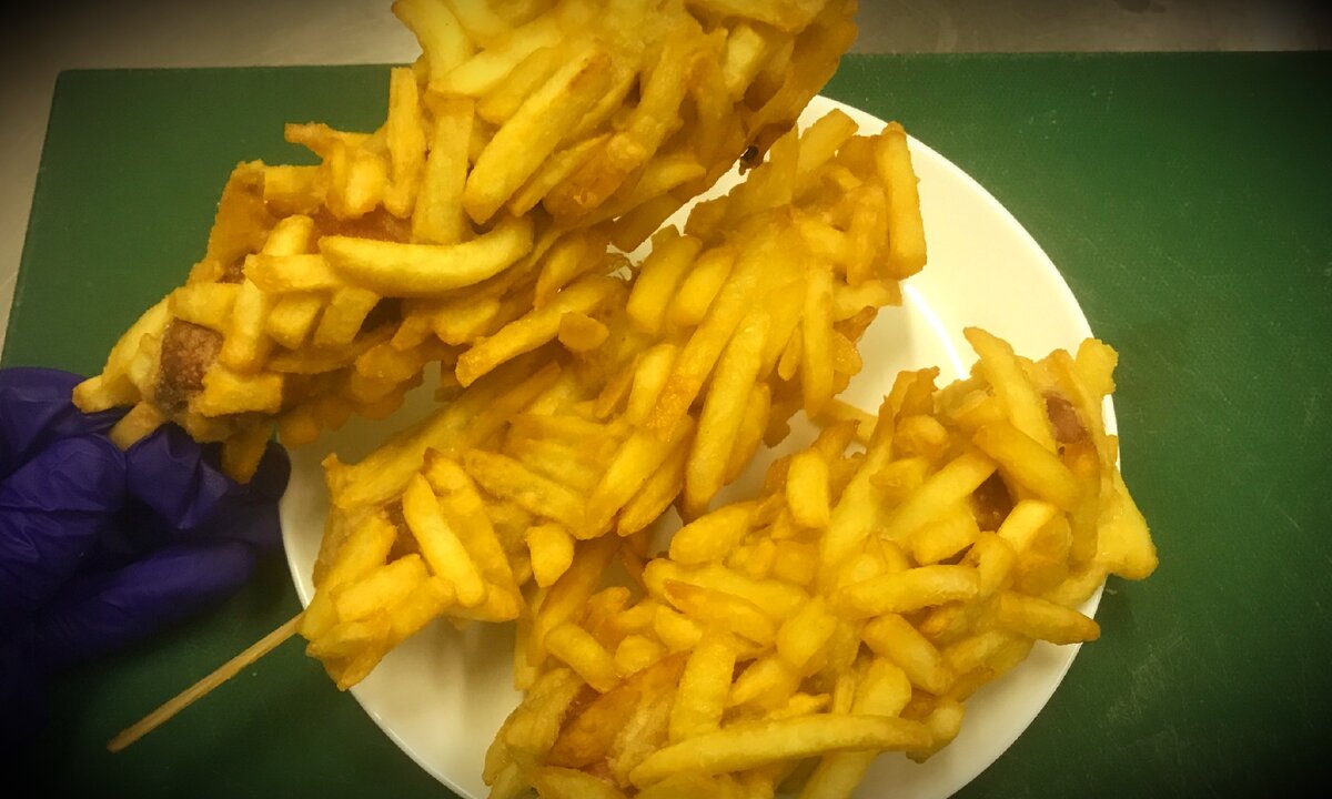 Все знают, что есть очень много вариантов приготовления сосисок в тесте. Я решил поделится неординарным рецептом сосисок. 100% что понравятся детям. Мои уже оценили- очень довольны. Так-что не будем тянуть резину приступим. Ингредиенты для рецепта, вы найдете в конце статьи. На 10 порций. Первым делом, конечно же подготовим сосиски, очистим от оболочки. Затем одеваем их на шпажки- типа мороженое «эскимо». Второй момент подготовки. Готовим тесто-кляр. Переливаем его в глубокий стакан (я использовал пивной пластиковый), это что бы удобнее было. И третий момент нашего подготовительного процесса-это картофель фри (использовал фри в размерном ряду 6х6). Картофель надо дефростировать (для того что бы удобнее было), далее все поймете. И да, картофель после разморозки, переложите в противень или любой плоский инвентарь (будет удобнее) Ну что ж начнем приготовление: 1 . Для начала сосиску держа за шпажку окунаем в тесто-кляр. 2 . Достаем ее и начинаем обваливать в картофеле фри (я думаю теперь