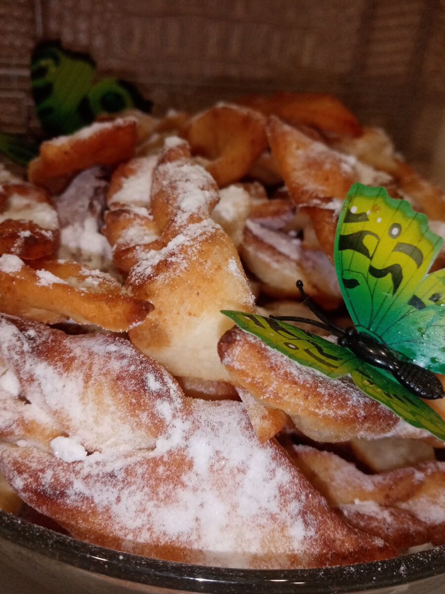 7. Как только хворост полежал на салфетки остыл переложите его в тарелку и присыпьте, обильно, сахарной пудрой.