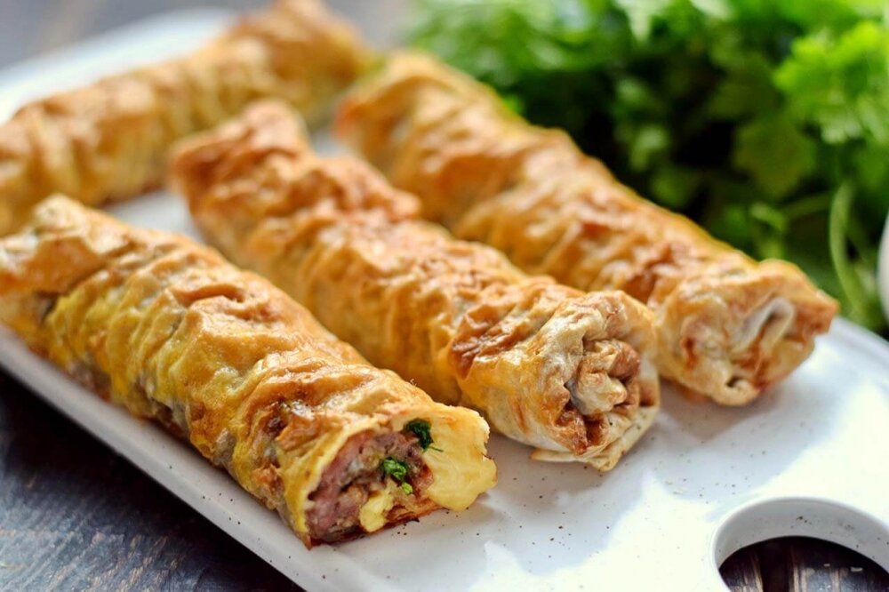 Готовим вкусную горячую закуску из тонкого лаваша. Подается закуска в виде трубочек с начинкой внутри. В качестве начинки используем мясной фарш, сыр и зелень, для пикантности можно добавить немного чеснока и специй. Внутри изделия получаются сочные и мягкие. Горячие трубочки отлично подойдут для завтрака или сытного перекуса, их можно брать с собой на пикник или работу. Приготовление: Заранее приготовьте фарш, перекрутив мясо в мясорубке, отлично подойдет смесь говядины и свинины. Лук очистите, нарежьте максимально мелко или перебейте в блендере. Зубочик чеснока пропустите через пресс. Зелень ополосните, нарежьте ножом. Все подготовленные компоненты добавьте в фарш, всыпьте соль, перец и любые специи к мясу. Смесь тщательно перемешайте до однородности, лучше руками. Тонкий лаваш разрежьте на два половинки. У вас должно получиться 4 одинаковые листа лаваша. Каждый лаваш с одной стороны смажьте мясной массой, охватывая весь периметр. Сыр натрите на крупной терке, стружкой присыпьте мясн