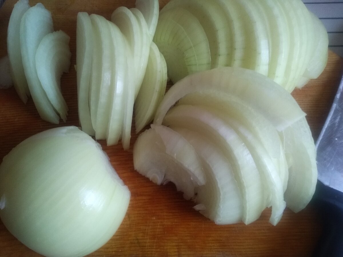 Лук почистить, нарезать полукольцами. Добавить к мясу.