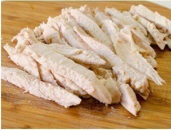 Сначала филе отвариваем в подсоленной воде, затем нарезаем полосочками (или разбираем руками на волокна).