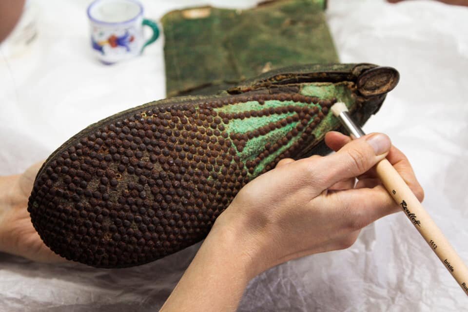 Художник-реставратор Анастасия Юрьевна Утехина выполняет механическую очистку сапога.