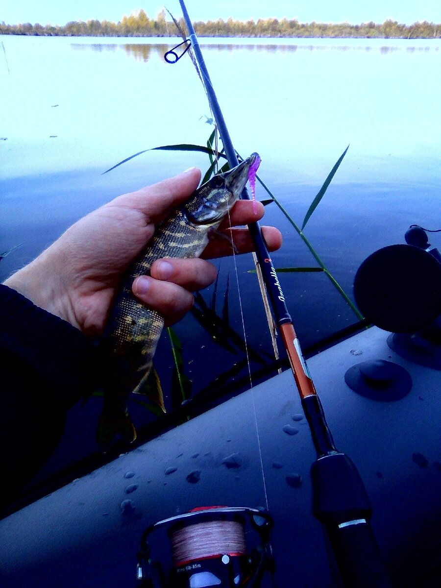 Был на озерах где-то с 10-30 до 17-00. Сначала прошелся воблерами по длинному озеру 3 раза. Обкидал всё. В итоге поймал на первом озере только одну щучку. Народа на озере сегодня было не мало. Потому я в итоге перетек на второе озеро в надежде, что там как-то побольше шансов именно сегодня (+думал окуня половить)