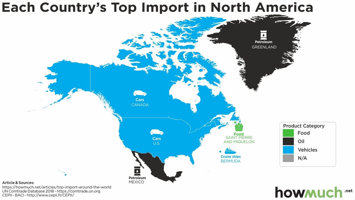 Недавно я писал о главных экспортируемых товарах в каждой стране мира. Сегодняшняя статья пойдёт о другой стороне картины - покажу, что является самым покупаемым извне в каждой страны мира. Взглянув на карту импорта стран, очевидно, что транспорт является самым распространенным двигателем международной торговли. Прежде чем анализировать расклад в разных регионах мира, давайте взглянем на картину в целом: Северная Америка Здесь всё довольно просто - американцы и канадцы любят покупать иномарки, а Мексика импортирует много нефти. Даже Венесуэла, чрезвычайно богатая нефтью страна, располагающая примерно 25% всех известных мировых запасов, импортирует нефть с международного рынка. Страны Карибского бассейна импортируют круизные суда и яхты, чтобы прокормить туристическую индустрию, которая там развита. Европа В Европе доминируют автомобили и нефть. Нефть является наиболее ценным импортом в Южной и Восточной Европе. Автомобили доминируют в торговле в большей части Западной Европы. Исключени