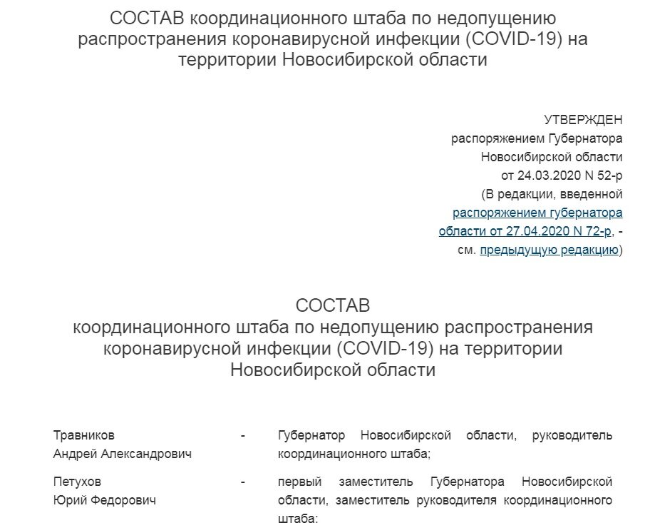 Официально этот орган называется «Координационный штаб по недопущению распространения коронавирусной инфекции (COVID-19) на территории Новосибирской области» (название пора менять – инфекция гуляет вовсю), и учрежден решением губернатора НСО А. Травникова еще 24 марта. http://docs.cntd.ru/document/465736131