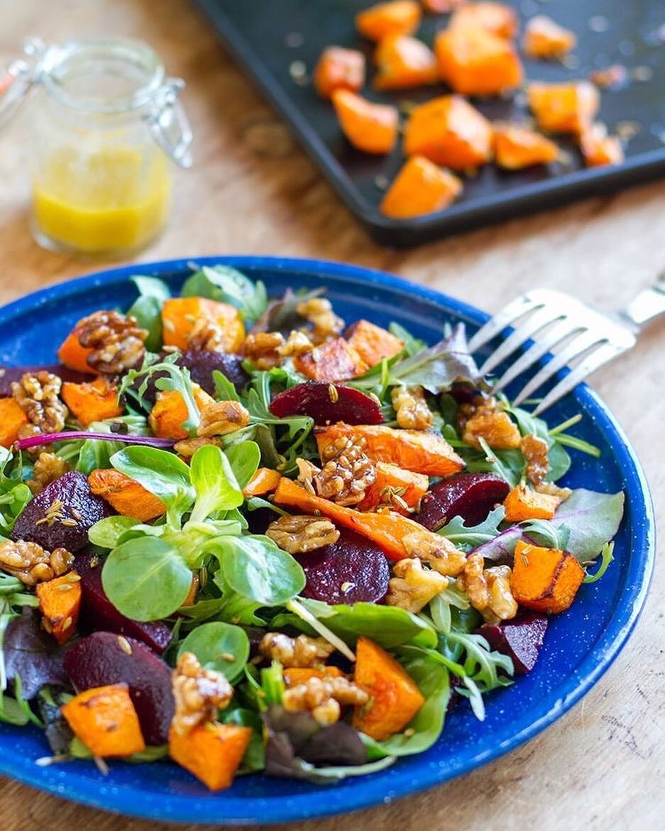- Сверху выкладываем тёплые корнеплоды ( не горячие), орехи, семена и поливаем соусом.