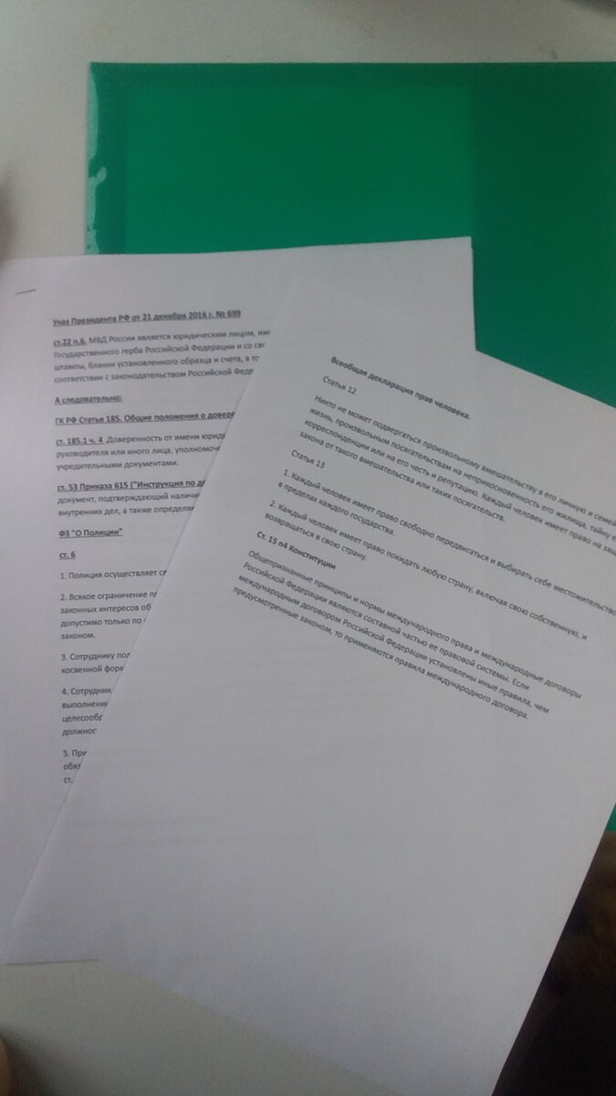 Как известно, уже давно в Московском метро "поездка возможна только в маске и перчатках". Однако, мы привыкли делать невозможное) Масок и перчаток у автора нет даже дома.) Но, кое-что брать с собой всё же стоит. Более полезное, чем настойчиво навязываемые дуриками девайсы.)) Например, у меня в рюкзачке всегда присутствуют: 1.) Зелёная папка с документами. 2) Бутылка с водой (1.5 л.). В этой зелёной папке у меня присутствуют: 1) извлечения из Всеобщей декларации прав человека (ст.12); 2) извлечения из Конституции РФ (особенно "Основы Конституционного строя"). 3)Выдержки из Закона о Полиции (ст. 14 - обязательно!), Указа Президента о МВД, Приказа МВД 615. Документы для этого. Дело в том, что когда Люди в форме (полицаи) хотят тебя привлечь по какой-то тупой причине (вроде не-ношения маски), то начичие извлечений из законов, которым они обязаны подчинятся, - быстро их отрезвляет. Можно им и просто сказать, а лучше сказать и показать И то, они тупят до последнего, стараются спорить