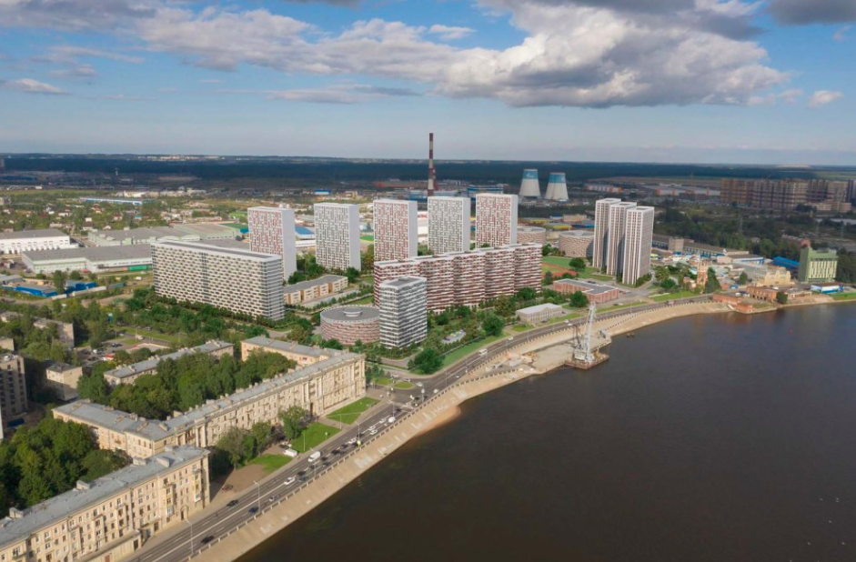 Группа «ЛСР» представила переделанный проект жилого квартала на углу проспекта Большевиков и Октябрьской набережной. Он призван нивелировать доминантную роль водонапорной башни Обуховского завода.