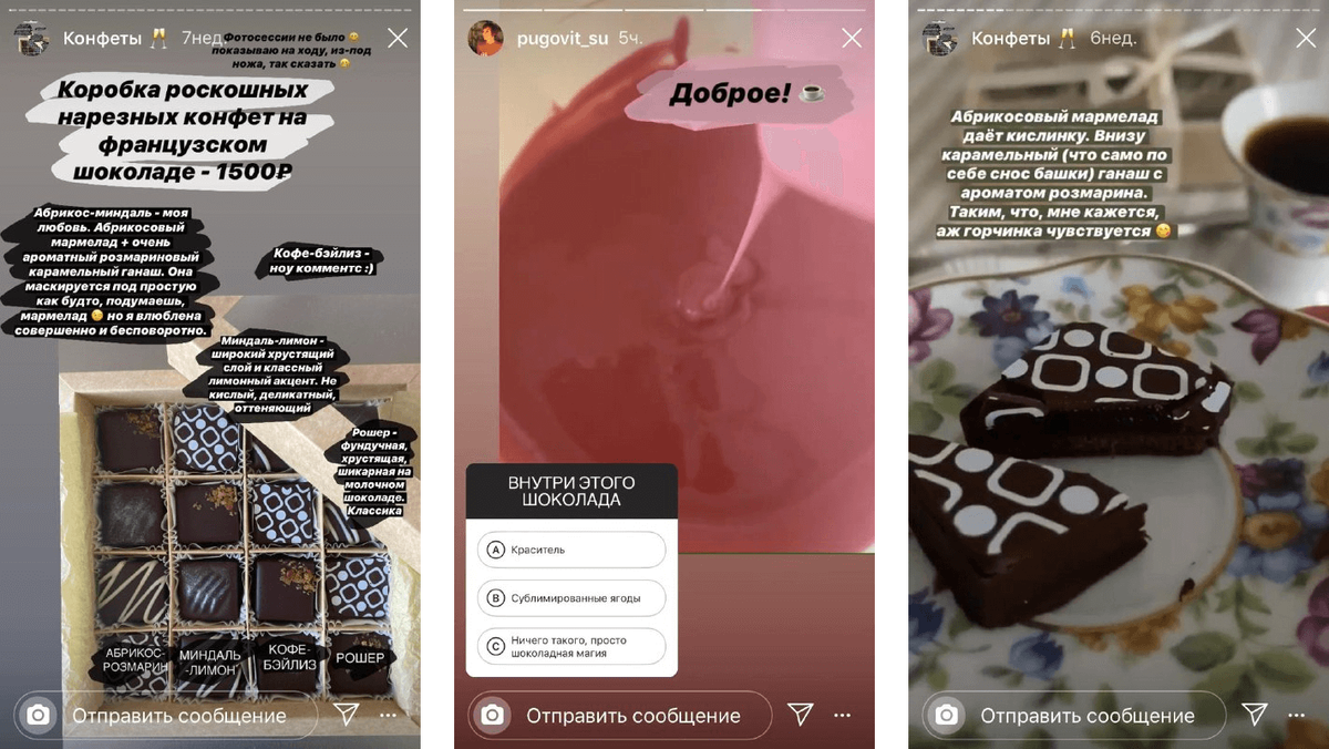 Если продаете, например, скетчбуки, то в Историях можно дать примеры заполнения или показать, как вы сами это делаете: