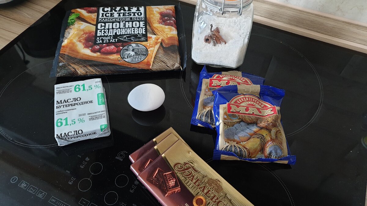 Решил, что моя булочка будет из слоёного теста. Выбор слоеного теста в близлежащих магазинах оказался не велик. Что касаемо кондитерского мака, в магазине #перекресток он был. Там же был приобретен шоколад по акционной цене.