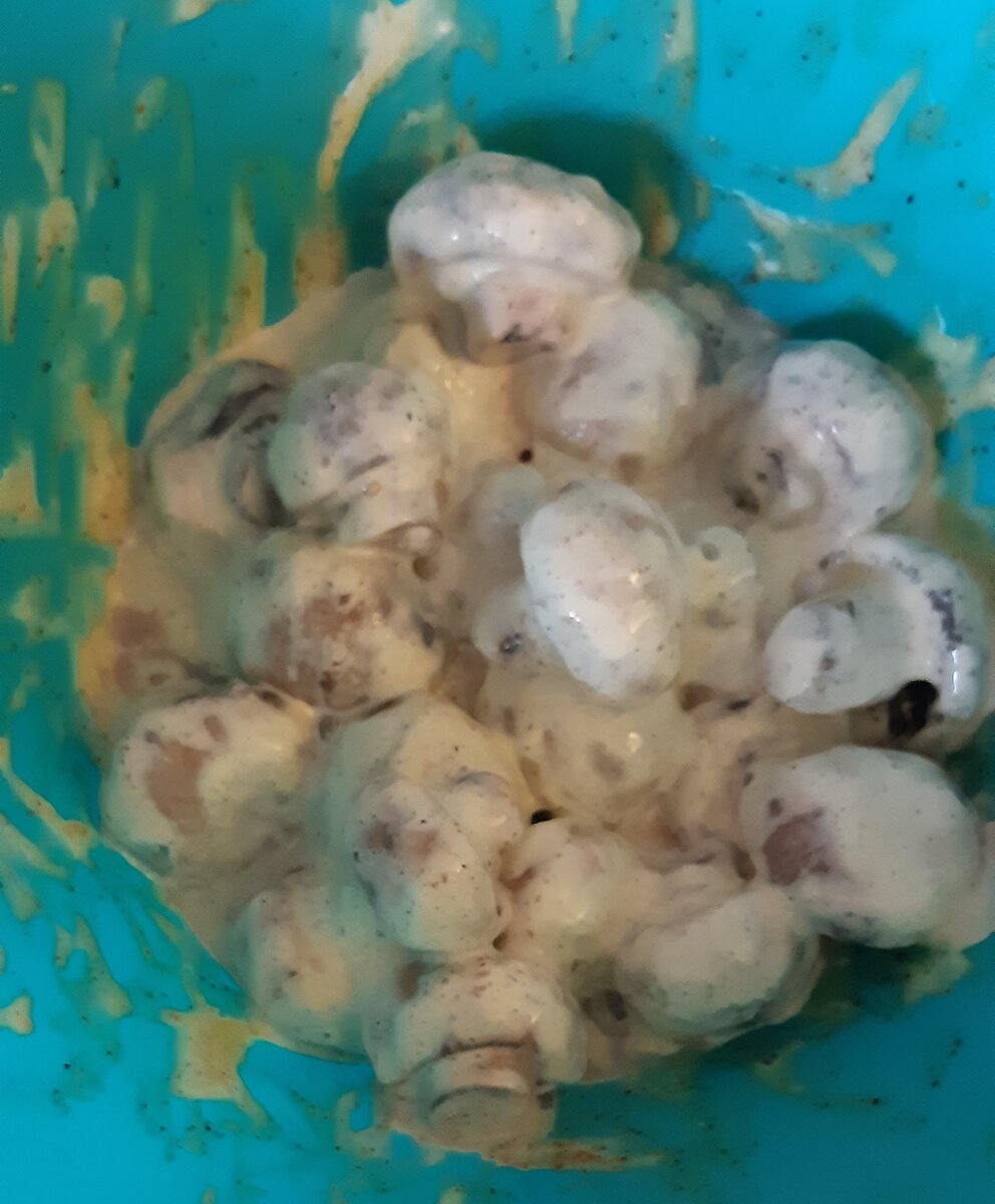 Итак, начинаем мариновать грибы. Для начала отчиищаем их от шкурки и промываем, чтобы не осталось земли, которая будет хрустеть на зубах. Далее, в чашку к грибам добавляем майонез, так, чтобы каждый гриб был полностью покрыт майонезом. Добавляем соль, чтобы маринад был слегка пересолёным, а далее специи по вкусу, в моём случае это обычная приправа - смесь перцев. Вот что получилось: