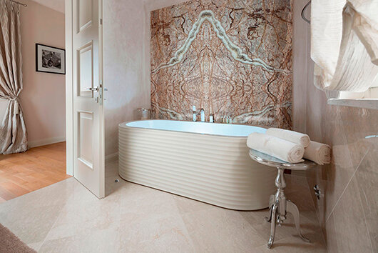 Благодаря витиеватости рисунка увеличивается количество вариантов составления панно "бабочкой", а пропускающий свет белый кварц