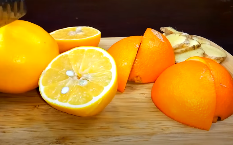 Апельсин и лимон выдавливаем в миску, туда же кладем имбирь.