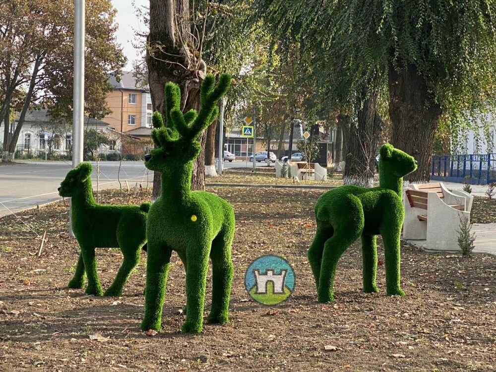 В Усть-Лабинске продолжается благоустройство городских улиц. Напомним, что в августе в городе появились первые топиарные (из искусственной зелени) фигуры животных. Мишка украшает городской парк, лошадь с жеребенком разместились на улице Демьяна Бедного, а горный козлик встал на перекрестке улиц Рабочая и Гагарина.
