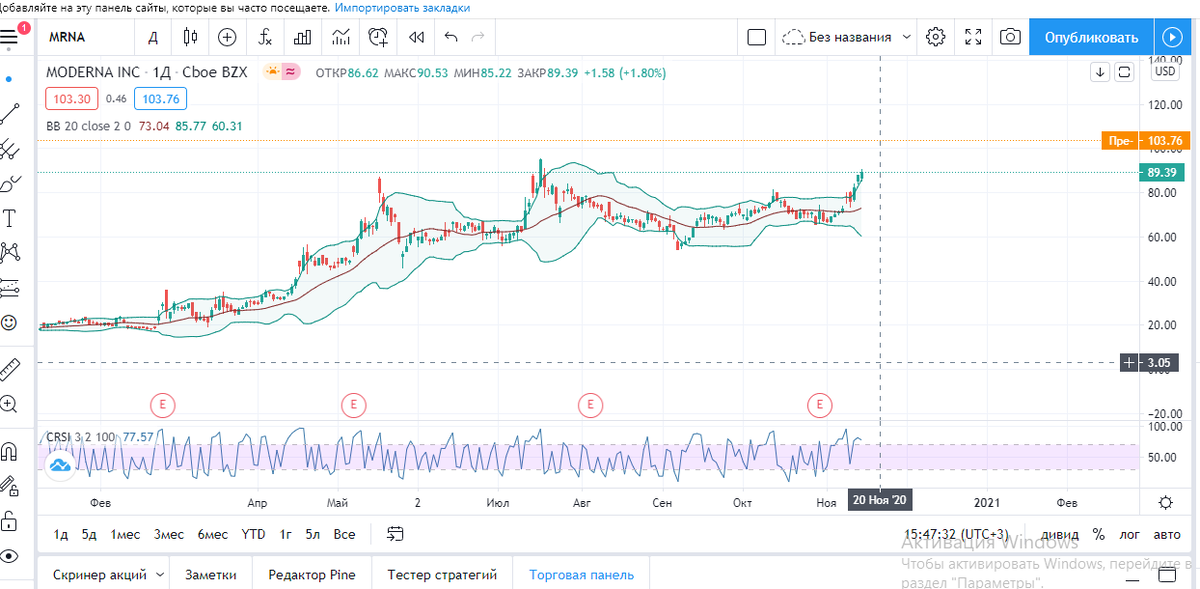 Акции компании #Moderna находятся в затяжной консолидации на восходящем тренде, формируется возможный торговый паттерн продолжения движения "Восходящий