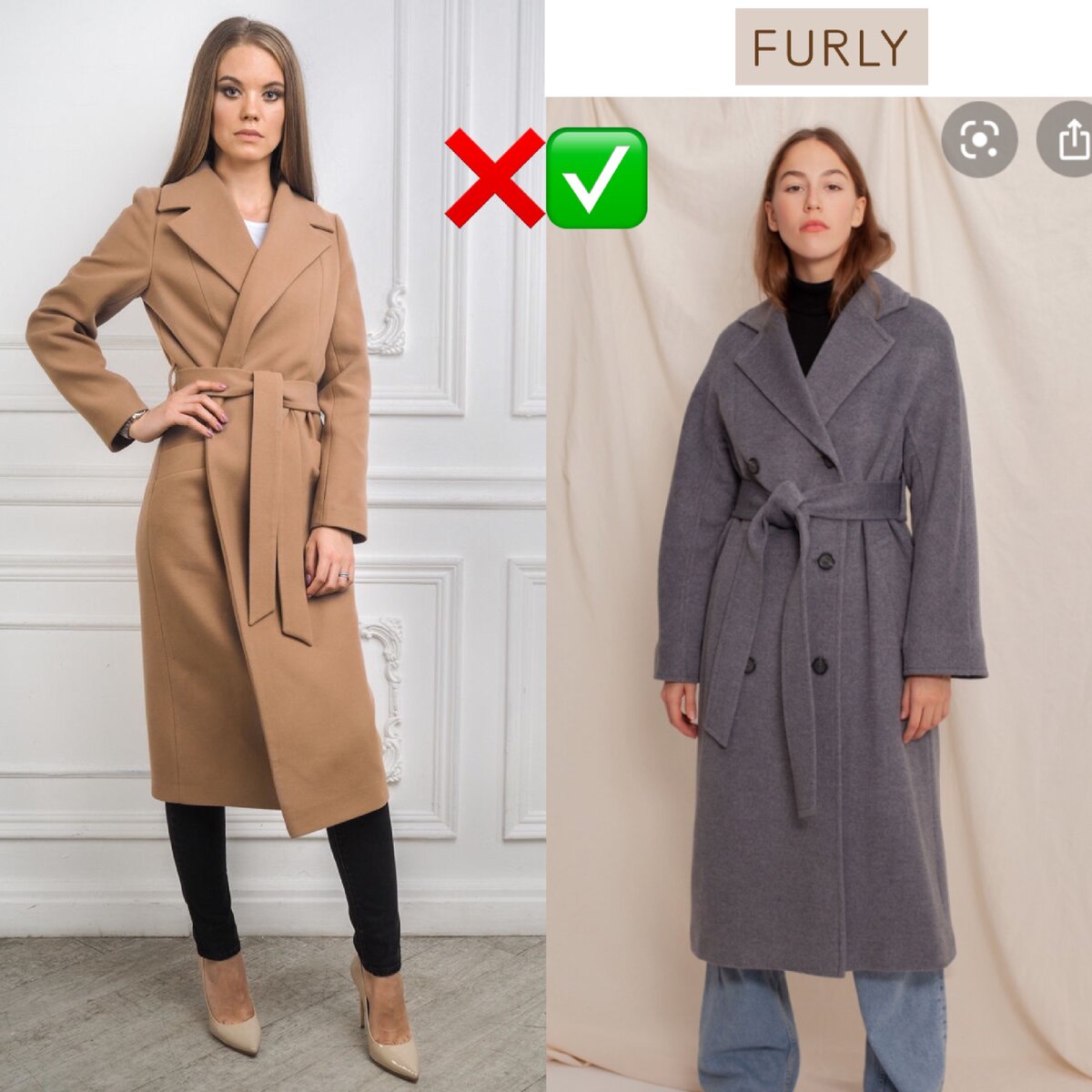 Второе пальто не плохое: оно красивого бежевого цвета (camel), хорошей длины, но ему словно не хватает воздуха! Поэтому второй вариант лучше, да и фасон плеч и пуговицы делают его современнее. Однозначно выбираем второе!