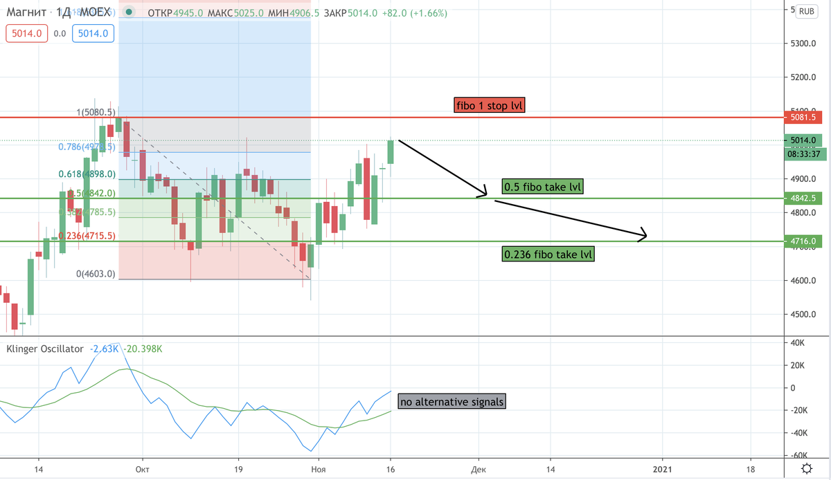 На графике у Магнита в последнее время всё неплохо. Но и не особо хорошо 🦑 Выстроив коррекцию по Фибоначчи