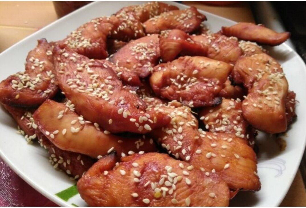 Продукты: Куриная грудка-1 шт. Соус соевый-1 ст.л. Мед-1 ст.л. Томатная паста-1/2 ст.л. Кунжут-1/2 ч.л ПРИГОТОВЛЕНИЕ: Перемешать соевый соус с медом и томатной пастой. Смесь хорошо