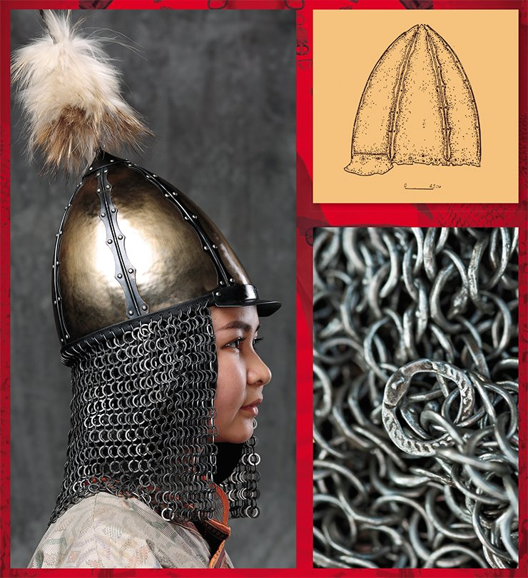 Предметная научно-историческая реконструкция шлема енисейского кыргызского воина XVII-XVIII веков (слева). Выполнена по случайной находке купола шлема и фрагмента кольчатого плетения в Хакасии [Фото А. Болжурова]. Купол шлема енисейских кыргызов (справа вверху), обнаруженный в Минусинской котловине (Хакасия) [Прорисовка Ю. Худякова]. Минусинский региональный краеведческий музей им. Н.М. Мартьянова. Фрагмент кольчатого доспеха XVII-XVIII веков, обнаруженного в Кошагачском районе (Горный Алтай). В центре: так называемое «кольцо мастера», фирменное клеймо оружейника или знак владельца.
