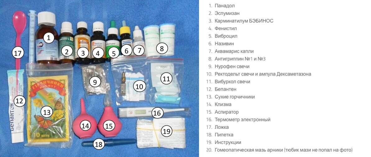 Данная аптечка предназначена не для лечения, а для ухода за малышом. Все препараты, если в этом будет необходимость, назначит вам врач. Специально что- то из медикаментов заранее покупать не нужно. Во- первых, они могут и не пригодиться вовсе, а во- вторых, не берите на себя ответственность, связанную с выбором препарата для малыша.