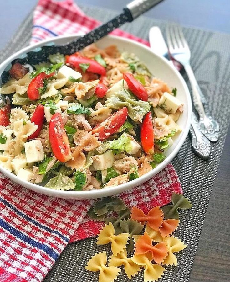 3. Макароны, тунец, острый перец, сыр, помидоры, базилик соединить, посолить и перемешать.