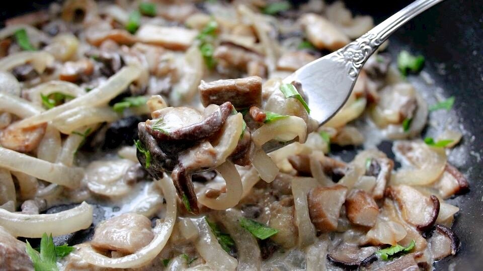 - Продолжайте готовить на сильном огне, пока вся жидкость не испарится и грибы не станут приобретать золотисто-коричневый цвет.