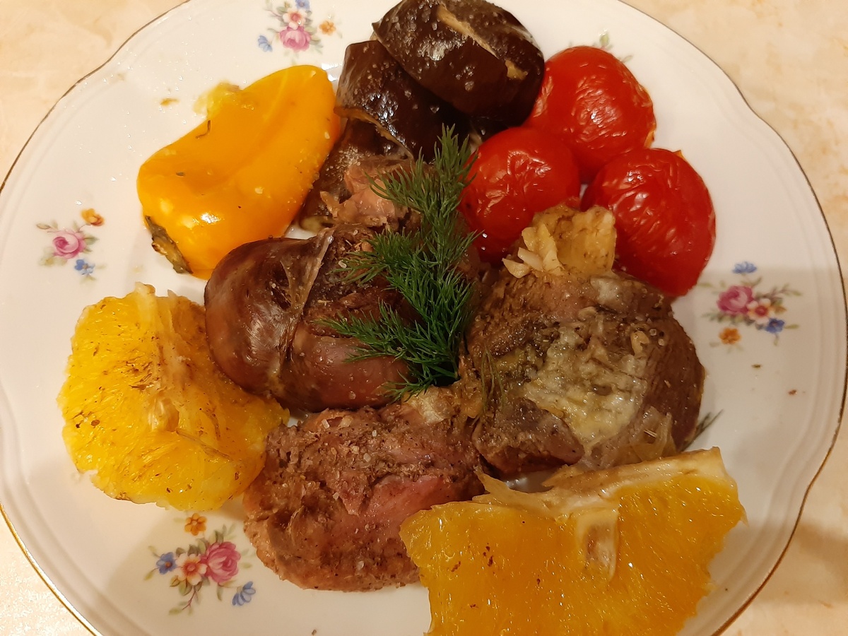 Сначала в горшочек загрузить только мясо, лук, чеснок и апельсин. Добавить 1-2 ст.л. бульона или воды. Готовить минимум 1 час (зависит от жесткости мяса). Затем добавить остальные овощи и готовить ещё 40 минут. Хотя и при первом варианте приготовления овощи не разварились. Пожалуй, слишком мягкими получились только баклажаны.