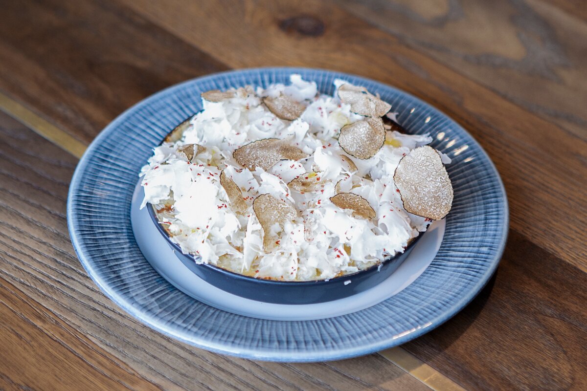 - Достаньте гратен из духовки, порежьте тонкими слайсами 20 г цветной капусты, натрите трюфель и посыпьте сверху. Полейте оливковым маслом.