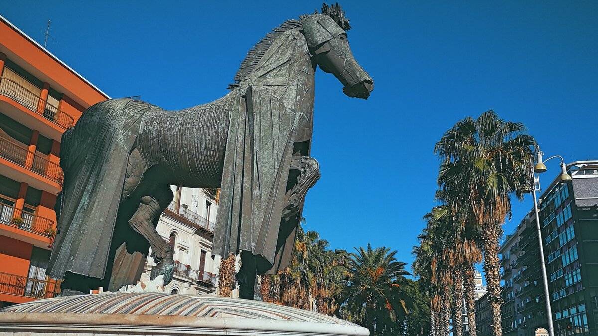 Перед одной из скульптур, мама остановилась и спросила: «А это кто?». Я выпалил автоматом: «Конь в пальто, вроде». Забавно получилось… На самом деле, это памятник коню одного из правителей Апулии. Установлена она на улице Витторио Эммануэле II (первому королю объединенной Италии), которая разделяет старую и новую часть города. Эту скульптуру создал итальянский мастер Марио Чероли и называется она «Конь в чепраке» (суконное покрывало, подкладываемое под седло).