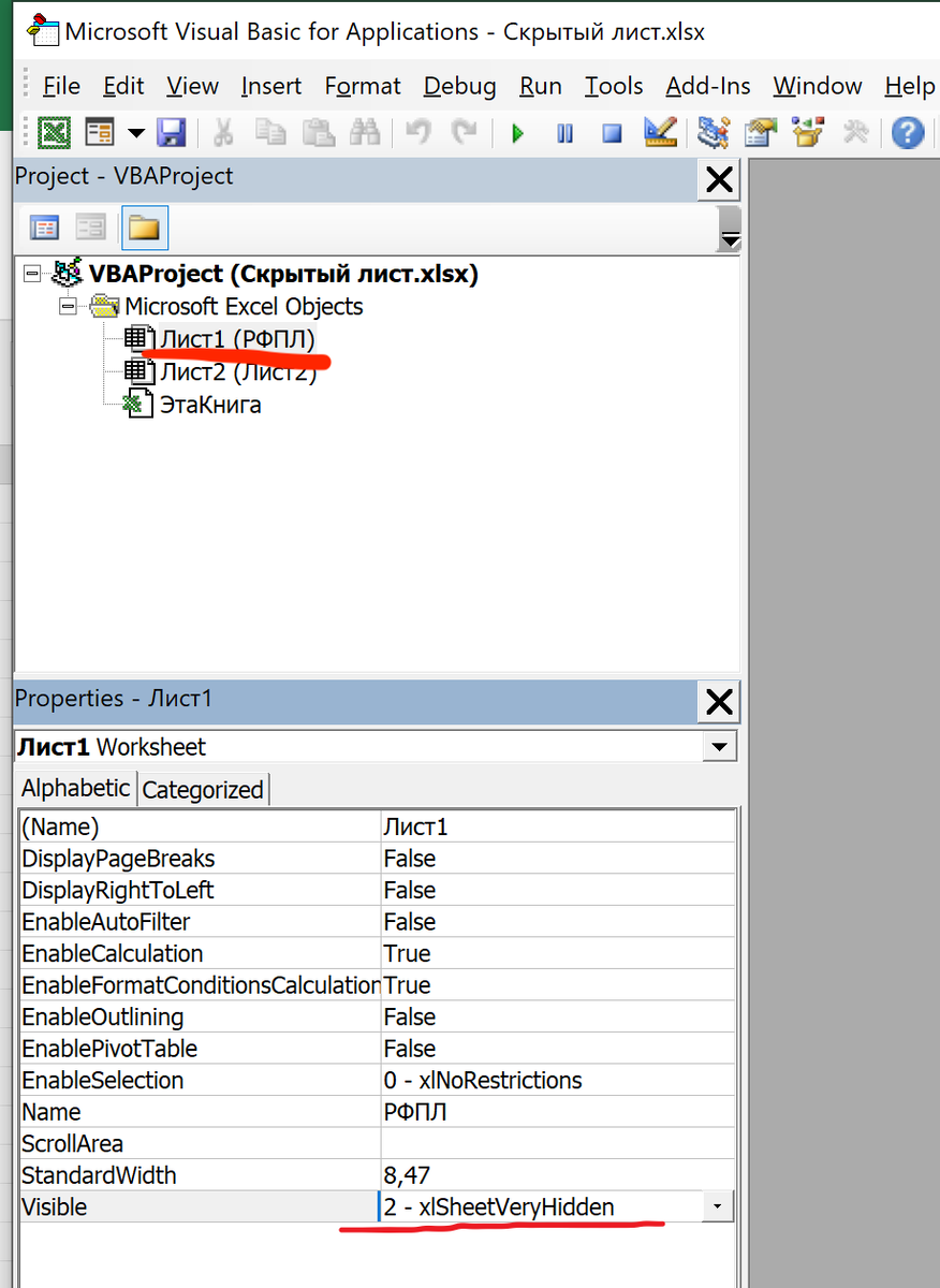 Очень часто мы можем столкнуться с ситуацией, когда нам нужно спрятать лист в эксель от посторонних глаз. Самый простой способ это просто нажать правой кнопкой мыши по листу и выбрать скрыть. Но используя этот способ есть риск, что файл найдут и внесут изменения. Поэтому я предлагаю воспользоваться моим методом и сделать супер скрытый лист, который уже никто не сможет найти.