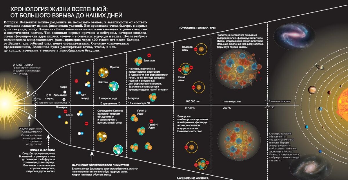 Вселенная существует почти 14 миллиардов лет. За этот очень длинный промежуток времени, она преодолела несколько эпох своей истории. Сейчас идёт 13—ый этап развития Вселенной, который называется «эра вещества».