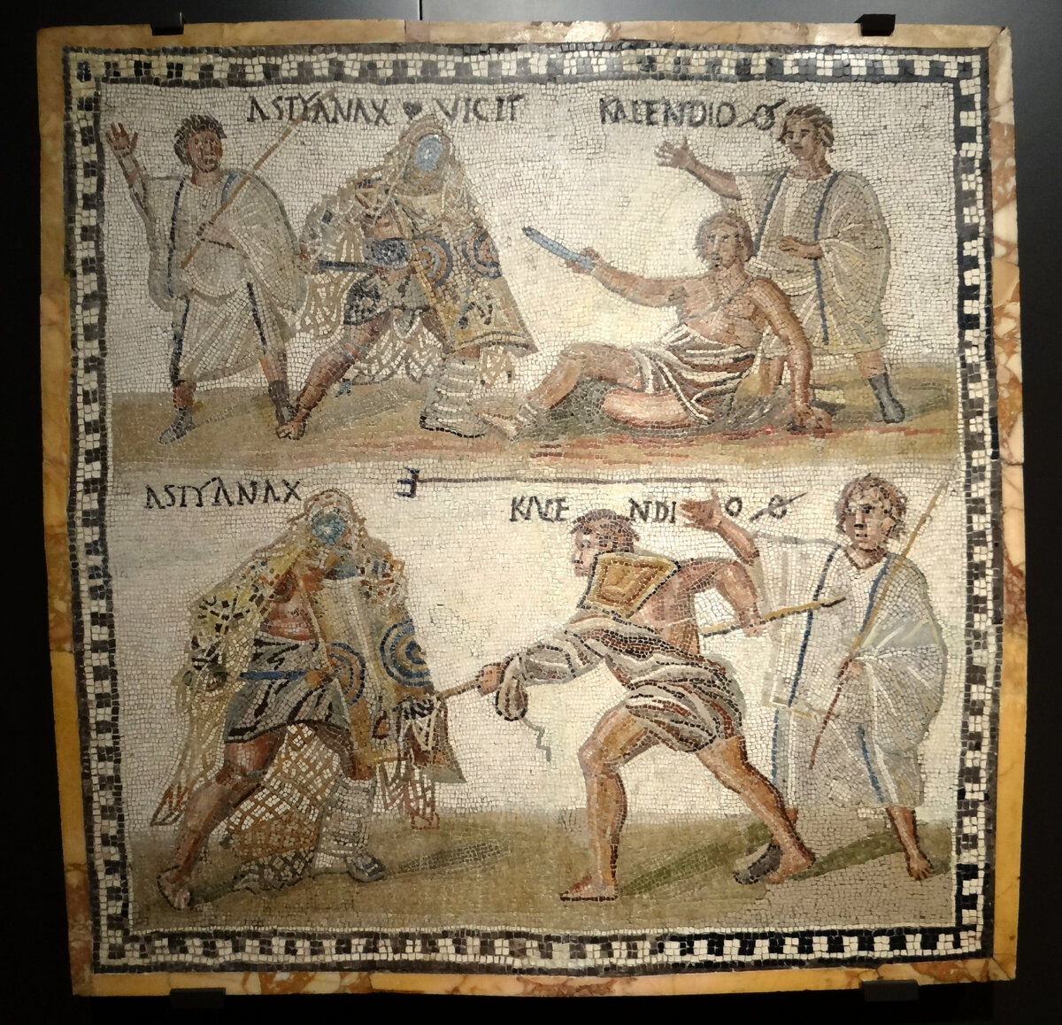 Мозаика III век н. э. изготовлена из кусочков мрамора и известняка, собранных в технике opus vermiculatum. Изображение делится на две части. В нижней сцене изображен начальный момент поединка между секутором Астианаксом и ретиарием Календионом. Рядом показан ланиста, или тренер гладиаторов. Календион удачно набросил на своего противника сеть и атакует его трезубцем.