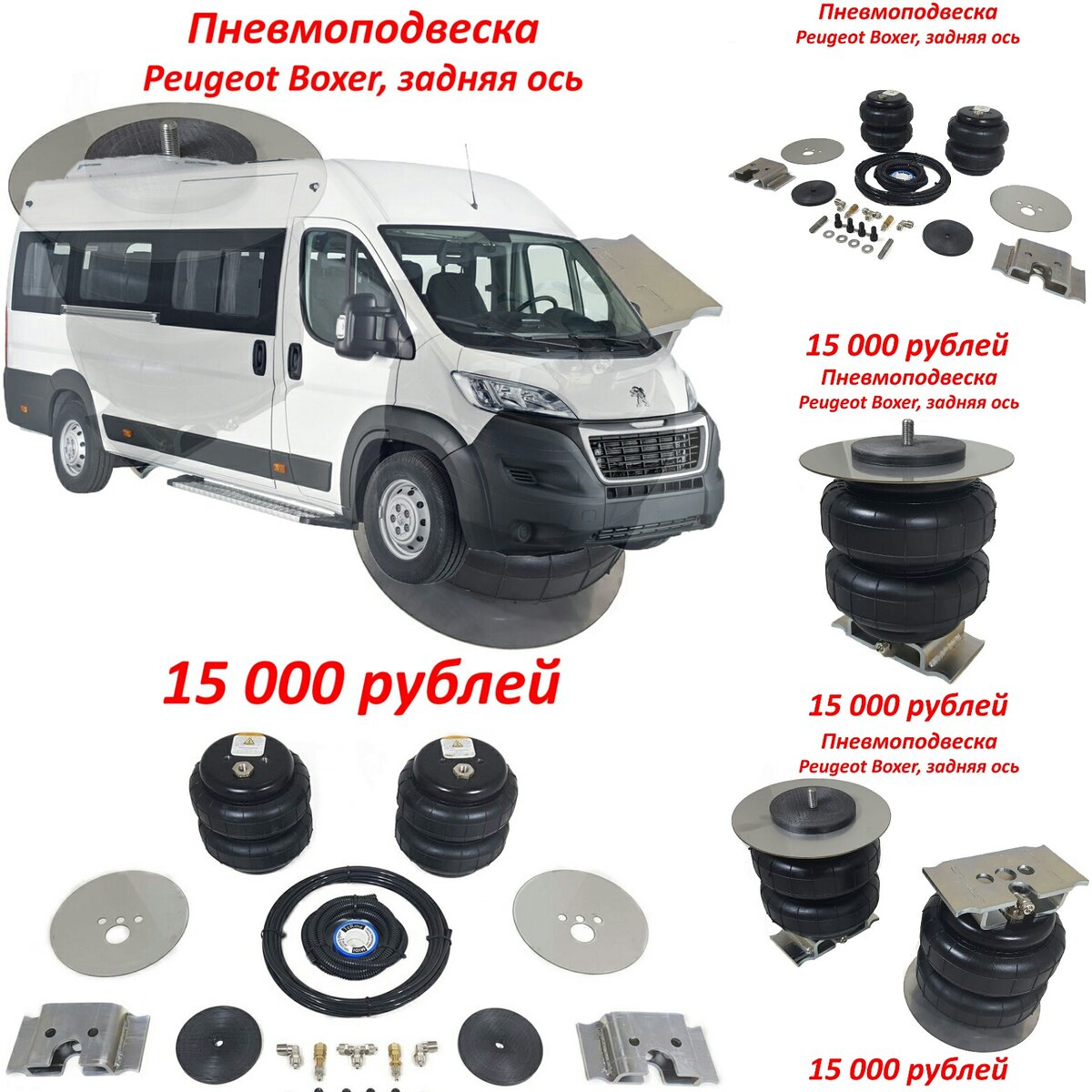 Задняя пневмоподвеска Пежо Боксер на пневмобаллонах типа двухсекционный сильфон 160D1 способна разгрузить штатные рессоры до 2200 кг. Комплект пневмоподвески Пежо Боксер на заднюю ось включает в себя все необходимое для установки. Установка пневмоподвески Пежо Боксер занимает порядка трех часов.