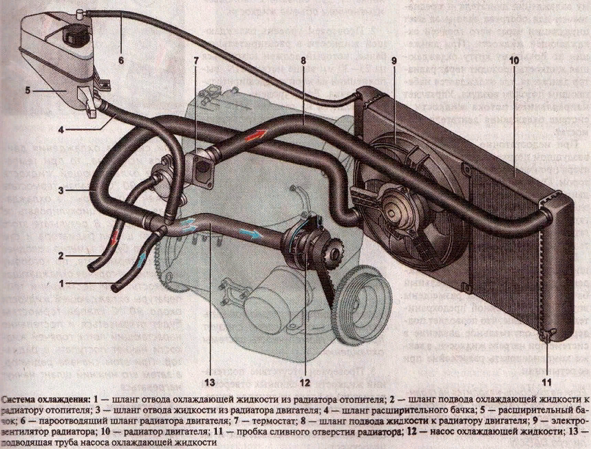 В систему охлаждения с помощью шлангов включен и радиатор отопителя салона.