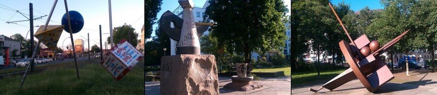 В этом гостеприимном городе нашлось место и для современных скульпторов. И каких скульпторов… Чего стоят одни только проткнутые железными стержнями геометрические фигуры на Warschauer Strasse. Та, что круглая, очень напоминает мне бракованый чупа-чупс на палочке.
