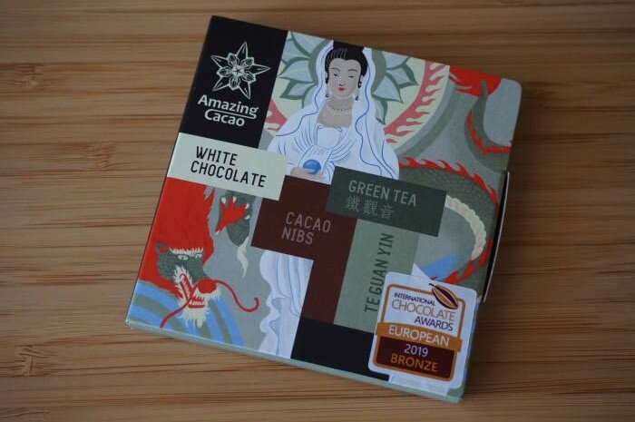 Чайная плитка от российских ремесленников Amazing Cacao - белый шоколад с зелёным чаем "Те Гуань Инь" и какао-крупкой.
