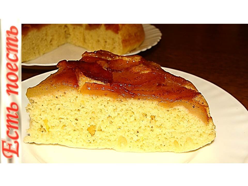 Когда будет готово, сразу же перевернуть пирог на тарелку, иначе яблоки прилипнут к сковороде.