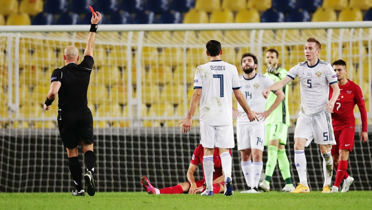 Удаление существенно повлияло на игру и турки сумели отличиться трижды в течении 26 минут.Сборная России отыграла лишь один мяч.