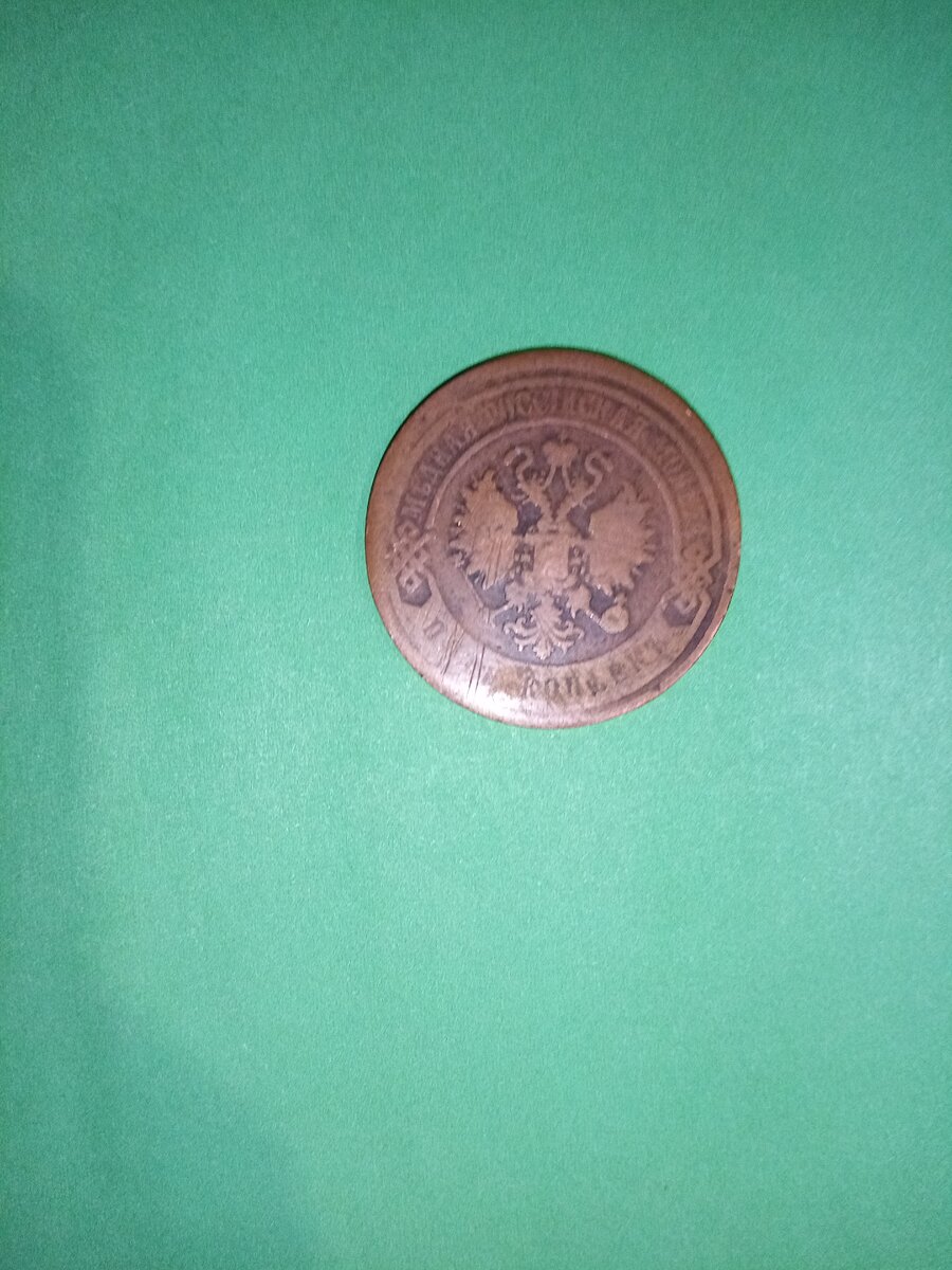 В центре монеты изображён Малый Государственный Герб Империи России-двухглавый орёл, головы которого украшена двумя коронами. Третья большая корона отчеканина над ними. Они соедены лентой Андрея Первозванного. В правой лапе орла изображён скипетр, а в правой держава. На груди до сих пор изображён Георгий Победаносец убивающий дракона. Материалом этой монеты является Медь. Гуарт рубчатый. Монетным