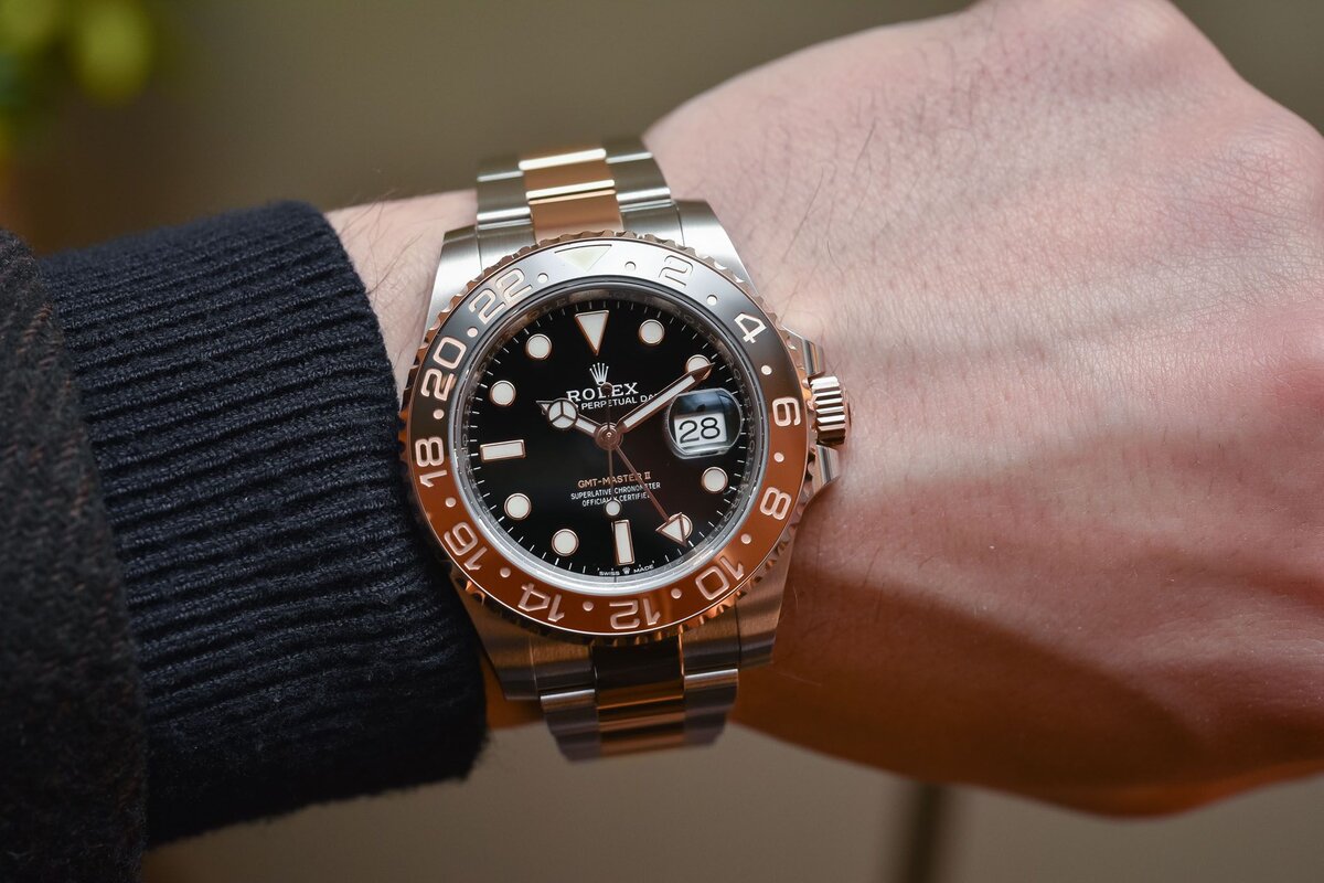 Начнём с Rolex «Рутбир» (в буквальном переводе «Корневое пиво» — так называется популярный напиток в Штатах). В артикуле часов 126711CHNR символы "CHNR" обозначают Châtain et Noir - буквально, каштаново-коричневый и черный — так характеризуется цвет безеля, который и стал родоначальником прозвища модели. А ведь и правда: двухцветный безель и сочетание нержавеющей стали и 18-каратного золота Everose делают часы похожими на популярную в США коричневую газировку.