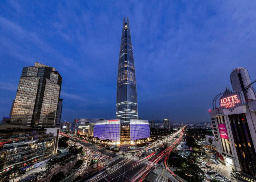 Lotte World – это стройный корпус, украшенный светлыми стеклянными панелями. По замыслу архитектора они должны напоминать национальную керамику. Башня находится на берегу реки и включает офисы, торговые центры, жилые апартаменты и гостиницы.