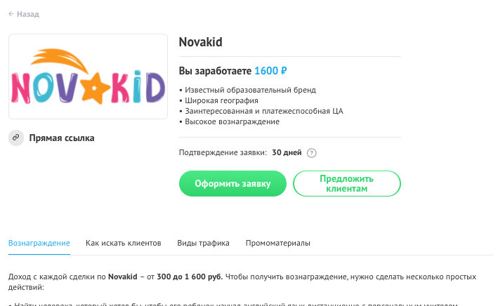 Рекомендовать мы будем курсы онлайн школы NovaKid. Это предложение недавно появилось на Workle и у него достаточно простое целевое действие - прохождение бесплатного пробного урока, за который можно заработать 300 рублей.